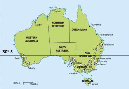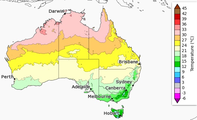 Apesar de serem encontradas oliveiras por quase toda Austrália, as regiões mais viáveis são as áreas em verde do mapa de temperaturas médias acima, representadas por: