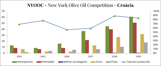 Com umas das taxas de sucesso mais altas do NYOCC a Croácia consolida sua posição de grande produtor de azeites. Parte desse sucesso vem da colheita manual e o controle dos demais pontos do processo. É claro que a qualidade da matéria prima, as azeitonas não pode ser ignorado.