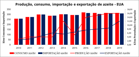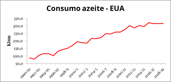 Quanto mais as pesquisas e divulgação dos benefícios do consumo do azeite extra virgem chegam ao público norte americano, maior é a procura pelo mesmo. E a tendência permanece. Em vinte anos (1998-2018) o consumo aumentou mais de 121%.