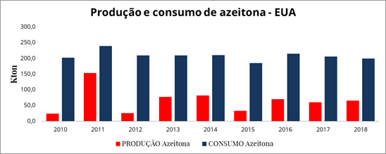 Os dados de produção de azeitonas não são claros, mas sabemos que em 2014 ocorreu a maior importação de todos os anos com 300 mil quilogramas, seguido por 200 mil quilogramas em 2010.