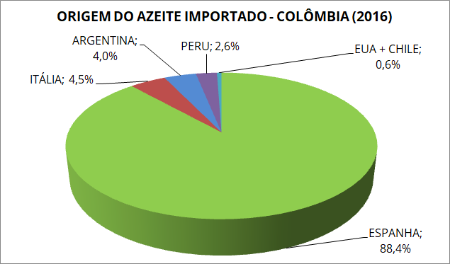 Quase todo azeite consumido na Colômbia é importado, principalmente da Espanha. Do total de 1.120.000 toneladas importadas no ano de 2016, 88,39% foram da Espanha, da Itália 4,49%, Argentina 3,98%, Peru 2,61% e Chile e EUA com percentuais inferiores a 1%.