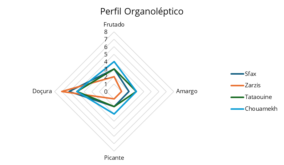 Pontuações expressas em uma escala relativa de 1 a 10 dentro do contexto sensorial tunisiano. Essas medidas ocorrem por meia em um painel de degustação e referem-se ao apresentado em um ano específico de colheita, mas servem como referência.