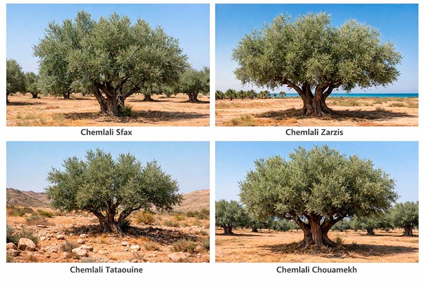 Chemlali Zarzis – Ecótipo mais adaptado ao sul costeiro; azeite ainda mais delicado. A aparência da árvore é um tanto semelhante à de Chemlali Sfax.