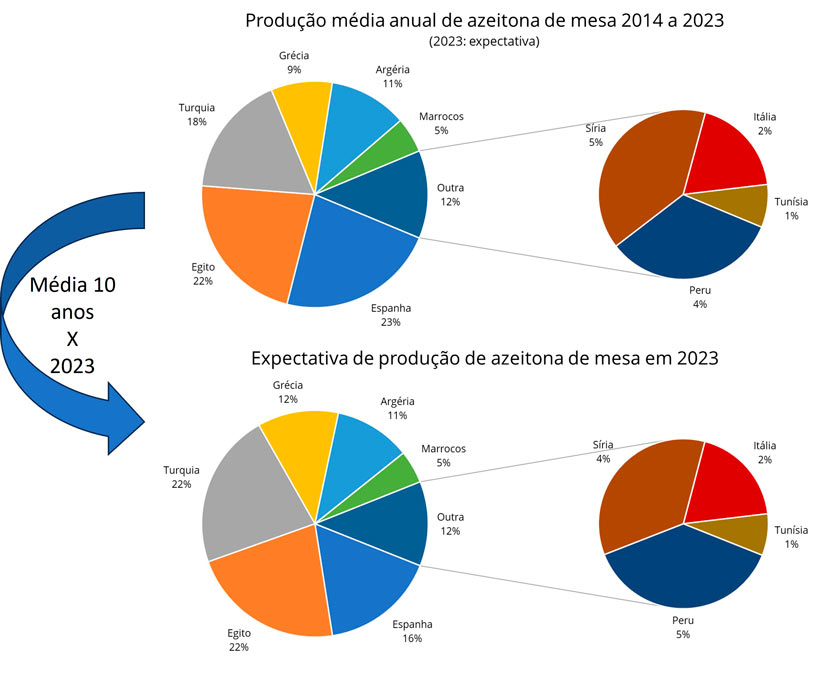 Uma análise rápida da imagem acima indica uma redução na participação da Espanha em 7% do mercado mundial, compensada com um aumento máximo de 3% sobre a produção da Turquia, substancialmente maior que os 3% da produção grega.