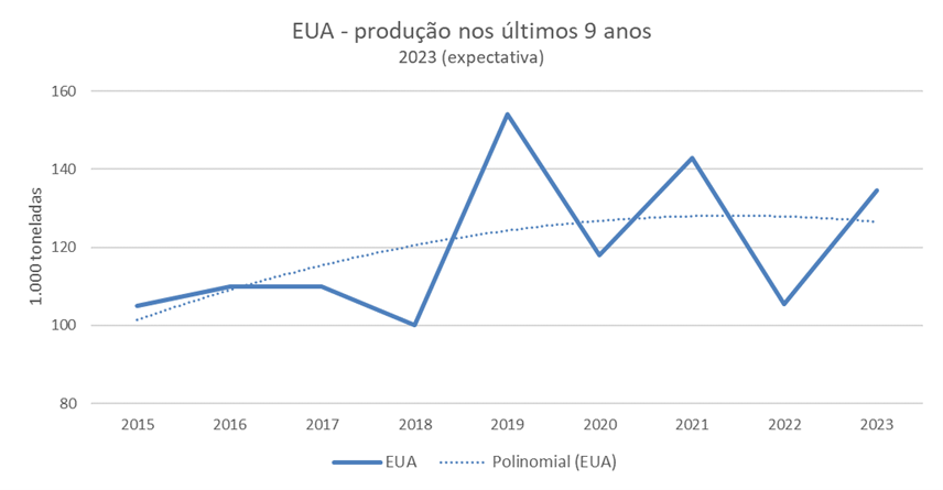Outro produtor com crescimento potencial é os Estados Unidos, contudo o mesmo é uma incógnita para o futuro, pois a principal região produtora, a Califórnia, está no mapa dos principais locais a serem afetados pela crise climática / desertificação.