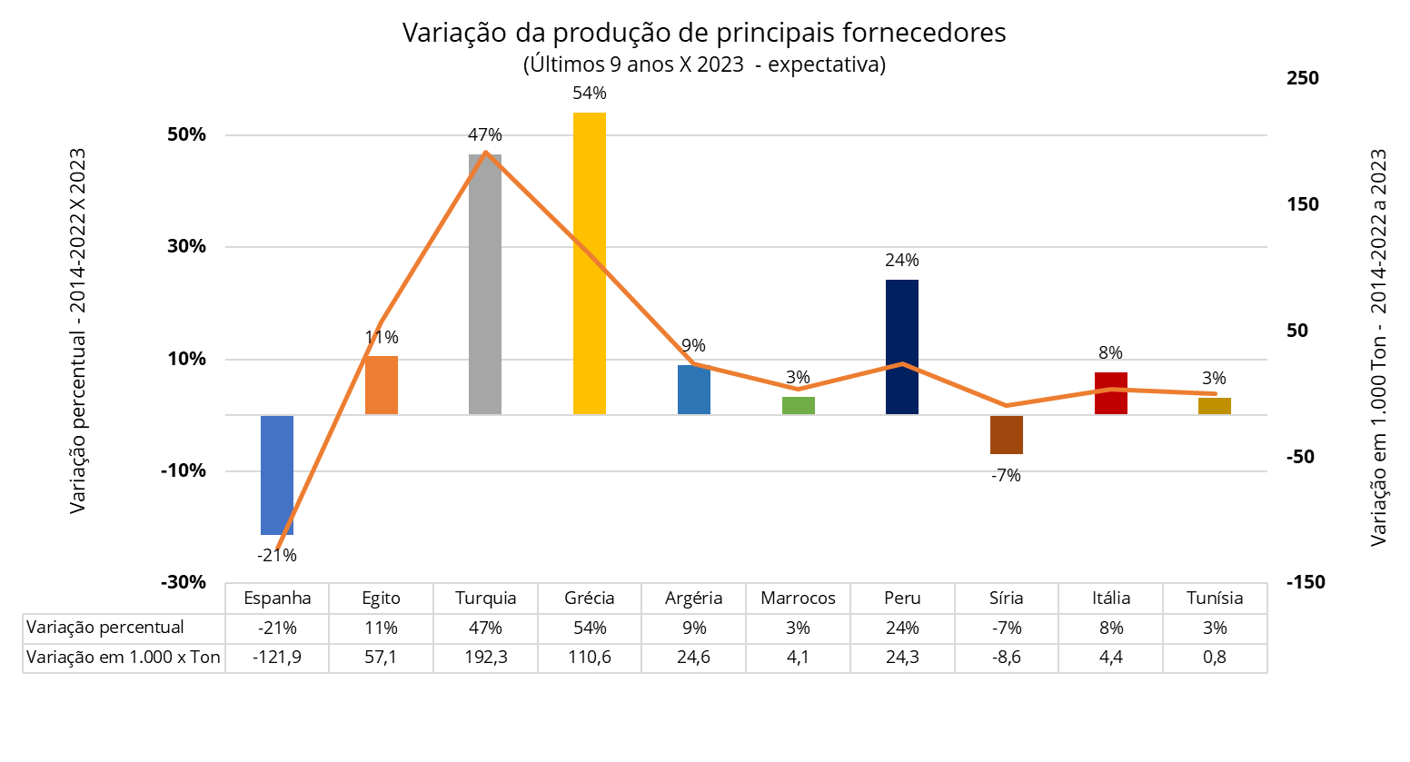 Uma análise rápida da imagem acima indica uma redução na participação da Espanha em 7% do mercado mundial, compensada com um aumento máximo de 3% sobre a produção da Turquia, substancialmente maior que os 3% da produção grega.