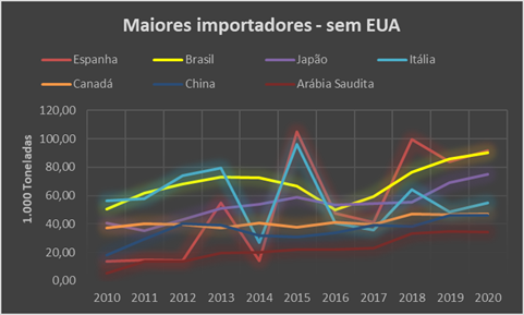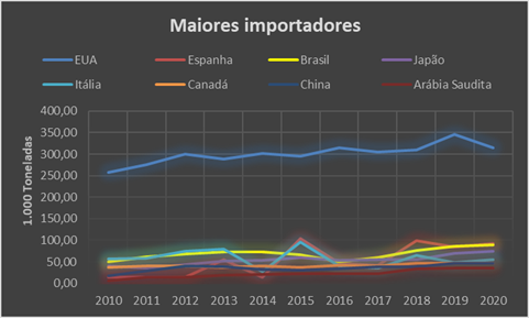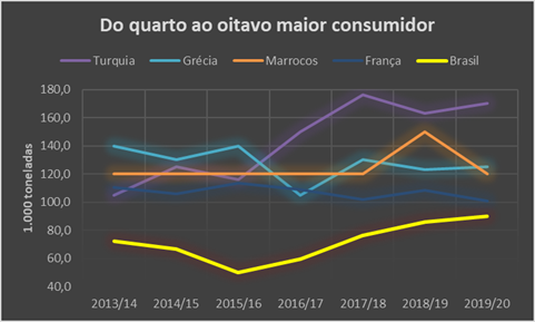 Em volume acumulado 2010-2020 (2020 é estimativa do IOC), a terceira colocação é da Itália e a quinta a Espanha. Citamos esses dois países, pois apesar de serem grandes produtores, a importação e destinada ao processamento e revenda, principalmente exportação.