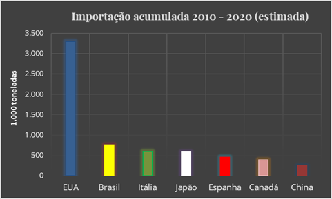 A Posição de consumo vem mantendo há vários anos, contudo quando fala-se em importação, o país é o segundo colocado, mas muito distante dos Estados Unidos.