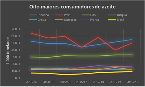 O levantamento foi feito pelo COI, onde mostrou que o Brasil importou 61,9 mil toneladas de azeite entre outubro de 2018 e maio de 2019 (total estimado em 2019: 90 mil Ton), 14% a mais que na temporada anterior. Apenas Japão (23%) e China (15%) registraram maior crescimento.