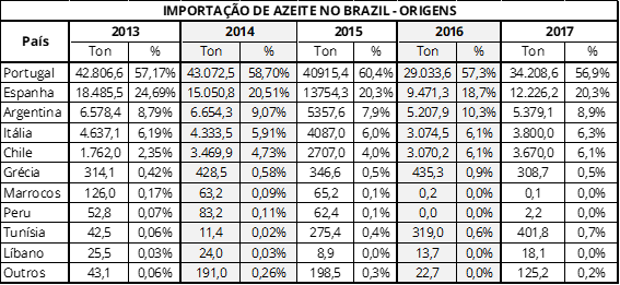 Segundo o Conselho Internacional do Azeite, 82% do azeite importado no Brasil vem da Europa. Portugal é o principal exportador, responsável por 59% das importações brasileiras. Espanha (16 por cento), Itália (seis por cento) e Grécia (um por cento) são os outros principais exportadores europeus. Argentina 10% e do Chile 7%.