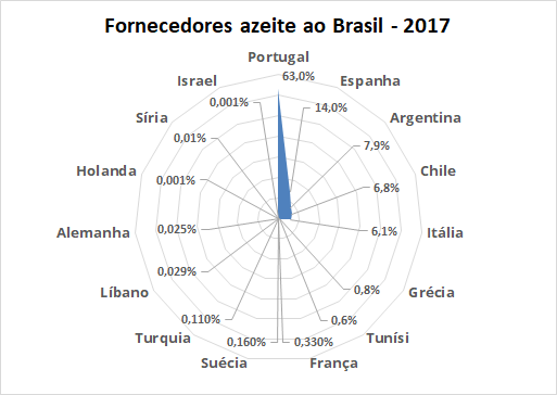 Segundo o OEC a quantidade total importada pelo Brasil em 2017 foi de 76,5 mil toneladas, ou seja: 82.702.702,70 litros de azeite. Logo a quantidade fornecida pela França foi de apenas 273 mil litros. A Suécia (não produtora) a metade disso. Portanto podemos entender que esses volumes não se trataram de uma demanda rotineira. Todos demais países, abaixo da Suécia podem ser enxergados desta forma: Demandas teste, evento, importação para revenda, etc..