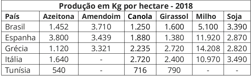 No caso do milho na Espanha, Itália e Grécia, em 2018, a colheita por hectare foi de: 11.920Kg, 10.970Kg e 14.208Kg, respectivamente. Não há cultivo de milho na Tunísia.