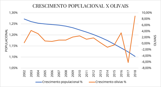 Olhando o crescimento da população, a formação de novos olivais consegue um leva vantagem: 26,33% de crescimento dos olivais versus 22,635% da população no mesmo período (2001-2018).