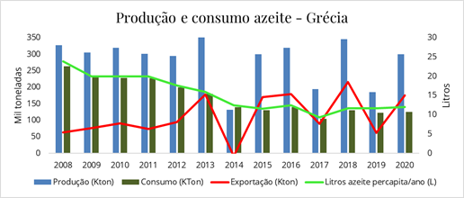 Apesar de um movimento de retorno ao campo ter ocorrido, justamente pela falta de emprego nas cidades, o consumo na Grécia não aumentou. O destino da aumento da produção foi a exportação, o que não é facilmente quantificado devido ao azeite exportado dentro da União Europeia não ser contabilizado pelo COI.