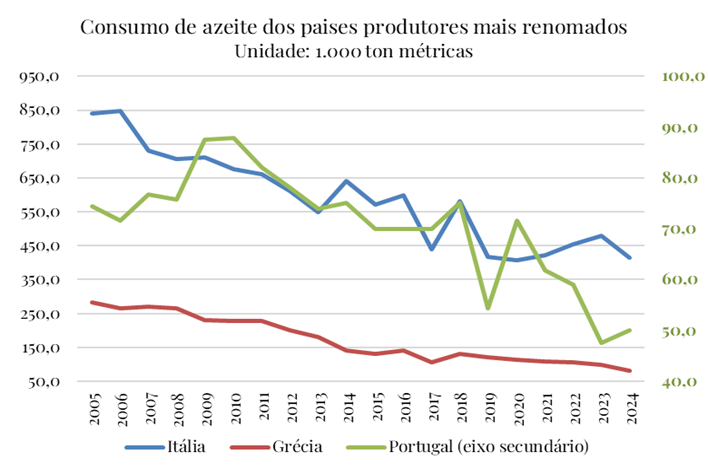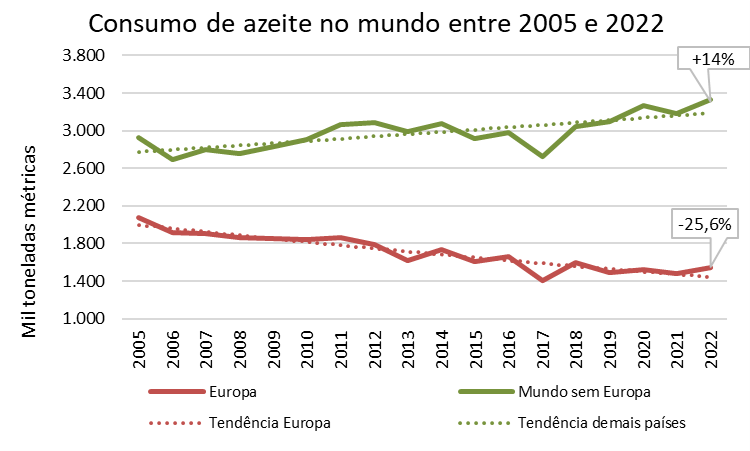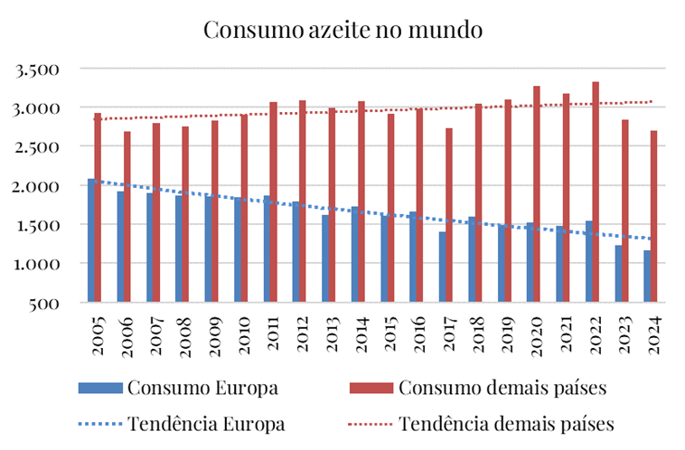 - Enquanto a Europa reduz o consumo — influenciando fortemente mercados exportadores que oferecem azeites de melhor qualidade — o restante do mundo registra um aumento no consumo, o que reforça o caráter especulativo dos preços do azeite.