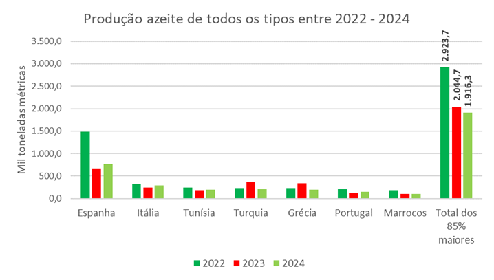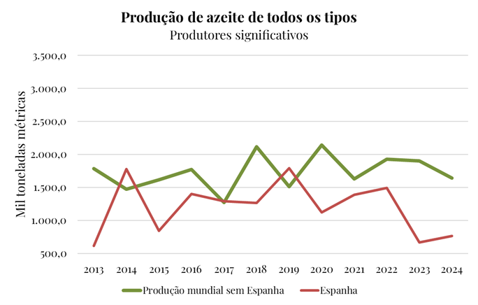 Observação: O gráfico acima representa a evolução da produção mundial de azeite de todos os tipos. Note que, mesmo com uma ligeira recuperação na Espanha, a previsão da produção total em 2024 ainda será inferior à do ano anterior, devido à queda na produção de diversos outros produtores, que em 2024 representarão 68% da produção mundial.