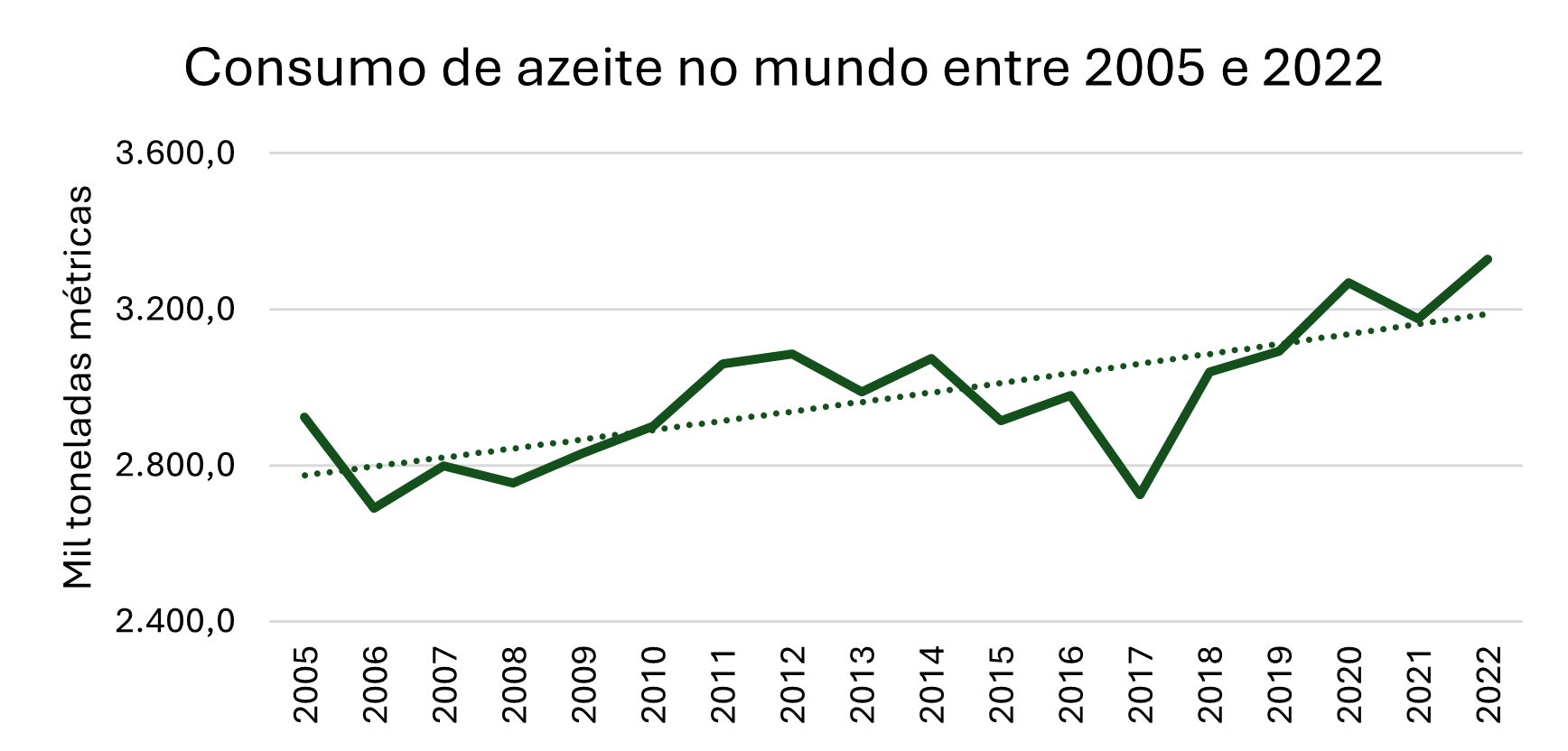 - O aumento de mais de 300% no consumo de azeite entre 2005 e 2021 foi impulsionado pela divulgação dos efeitos benéficos do azeite para a saúde. Infelizmente, observamos que alguns produtores nacionais e da América do Sul adotaram uma postura especulativa, priorizando ganhos imediatos em vez de buscar um posicionamento sustentável e competitivo no mercado.