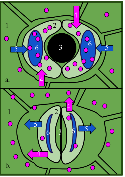 Um estômato consiste de duas células estomáticas – células de guarda(2), reniforme, que delineia o estomatal ou ostíolo (3). Ele abre mais ou menos, conforme necessário, dependendo do Turgescência – absorção de água(5) das células estomáticas. Sob o ostíolo é encontrado, geralmente no Parênquima*, em um espaço vazio chamado câmara sub-estomática. As células de guarda são feitas de vacuoles – Vacúolo (6).
