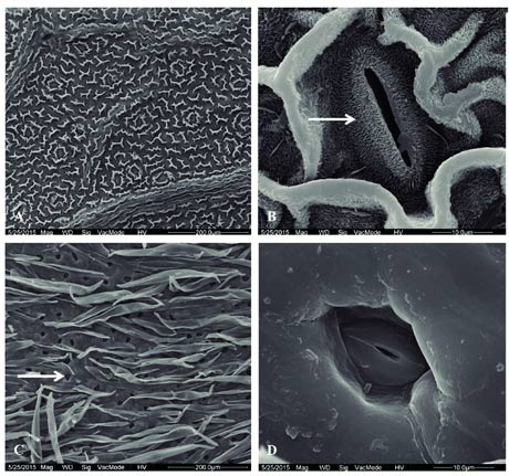 C) Camada de cera com crostas esporádicas, mostrando tricomas e estômatos afundados (seta).