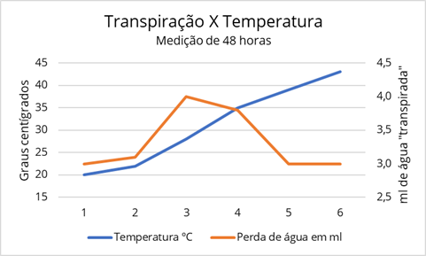 Os ramos forma mantidos em frascos com divisões em mililitros por 48 horas, findas as quais observou-se o volume de água transpirado. Era de se esperar que quanto mais alta a temperatura, mais água houvesse evaporado, contudo, dada a abertura máxima dos estômatos ter ocorrido na amostra a 28º C, justamente essa amostra evaporou maior volume d’água.