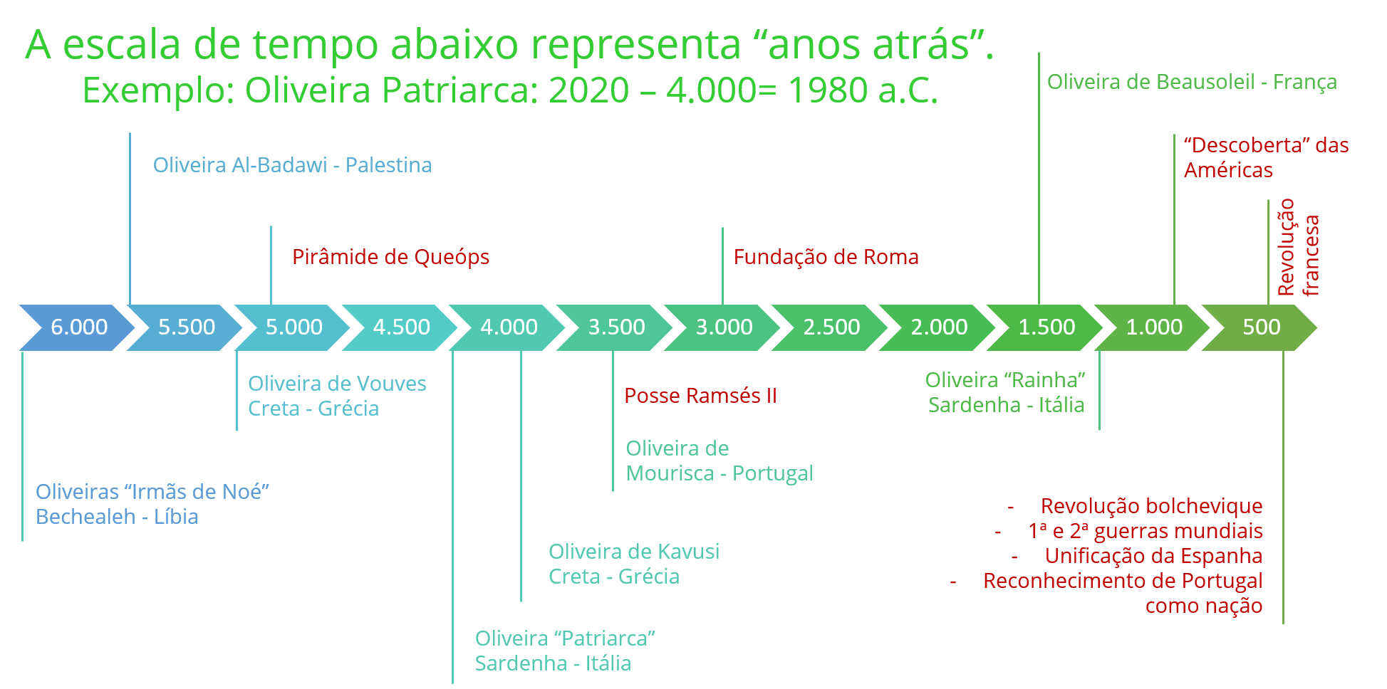 Para dar uma visão sobre essa questão, montamos uma linha do tempo que ajudará entender o quanto essas olivieras já viveram.