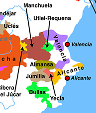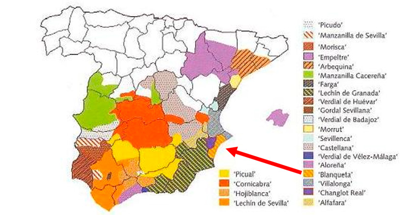 Localização dos principais cultivares da Espanha com destaque para a Blanqueta