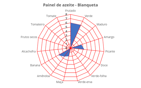 Em uma degustação do azeite, forma observado os valores abaixo plotados em um painel. Isso é valido apenas para a degustação observada, pois condições edafoclimáticas, genética das árvores, manejo e processo de extração podem intervir no resultado. Vale como uma média para um azeite bem processado do cultivar Blanqueta.
