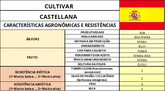 De pouco destaque, inclusive dentro da Espanha devido a qualidade mediana de seu azeite, mas com destaque para outros atributos morfológicos e agronômicos, o cultivar Castellana é de importância “1” em uma escala de 1 a 5.
