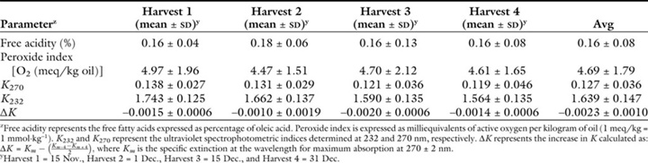 Os dados representam valores médios dos óleos obtidos nas quatro safras estudadas em três safras consecutivas (2010–11, 2011–12 e 2012–13). – Citação: HortTechnology hortte 28, 1; 10.21273/HORTTECH03845-17