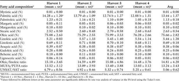 Composição de ácidos graxos de azeites virgens obtidos de ‘Castellana’ em quatro épocas de colheita. Os resultados representam os valores médios de três safras consecutivas (2010–11, 2011–12 e 2012–13).