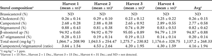 Composição esterólica dos azeites virgens ‘Castellana’ obtidos em quatro épocas de colheita da azeitona. Os resultados representam os valores médios de três safras consecutivas (2010–11, 2011–12 e 2012–13). Nenhuma diferença estatística foi encontrada em 5% pela análise de variância de uma via e teste de Tukey.