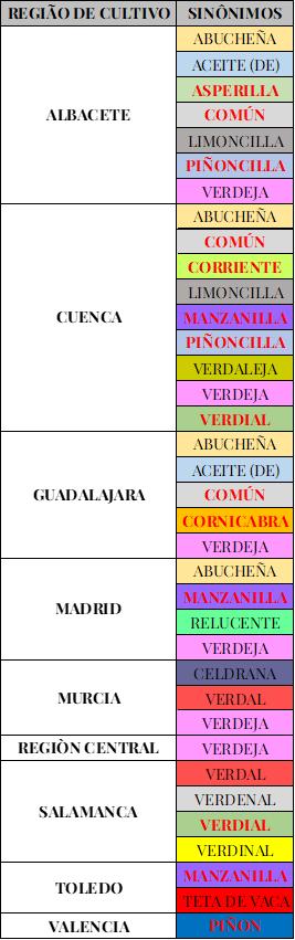 As províncias da comunidade Castilla-La Mancha, local de surgimento do cultivar, mantém-se como locais de presença dos principais olivais, bem como a Comunidade / Província / Cidade de Madri (Barranco Navero D., Cimato A., Fiorino P., Rallo Romero L., Touzani A., Castañeda C., Serafini E., Trujillo Navas I. World catalogue of olive varieties. – 2000, Pag: 360. COI, Mundi-Prensa. Madrid, Spain), vizinha de Castilla-La Mancha.