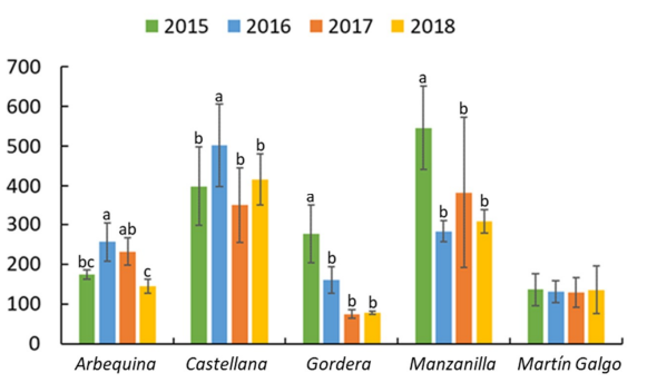 Teor total de fenóis dos azeites monovarietais produzidos com as variedades de azeitonas cultivadas na DOP Aceite de la Alcarria durante as quatro safras consecutivas de azeitonas em estudo. Valores médios das amostras elaboradas em cada estação. Letras diferentes dentro de cada variedade indicam diferenças significativas entre as estações (teste de Duncan p<0,05).