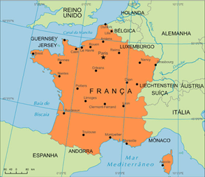 França oficialmente República Francesa, está localizada na localizado na Europa Ocidental e detém a possessão de diversas ilhas e territórios ultramarinos. O território da França continental, sede do governo, vai do Mediterrâneo ao Canal da Mancha ao Mar do Norte. Do rio Reno ao Oceano Atlântico. Possui um formato hexagonal. Faz fronteira com Bélgica e Luxemburgo a norte; Alemanha a nordeste; Suíça e Itália a leste. Ao sul com a Espanha e com as “cidades nações” de Mônaco e Andorra. Em área é o maior país da União Europeia e o terceiro maior da Europa, atrás apenas da Rússia e da Ucrânia (incluindo seus territórios ultramarinos, como a Guiana Francesa.