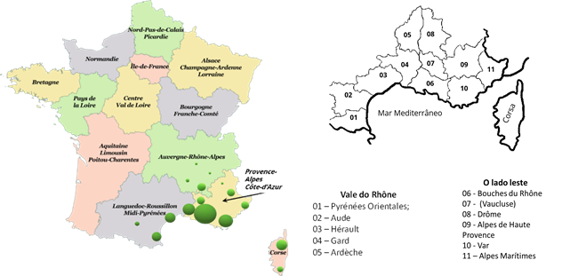 A França é cortada pelo paralelo 45ºN que deixa menos de 1/3 do seu território na zona teórica adequada a Olivicultura. Justamente nessa região é que se concentram os olivais: Nos 5 departamentos da região de Provence – Alpes -Costa Azul (Vaucluse, Var, Bocas do Ródano, Alpes da Alta Provença e Alpes Marítimos).