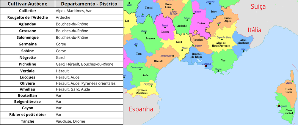 | Olivière | Angelon Sage, Becarude, Bouteyenque, Bécaru, Béchu de L´Ardèche, Bécu, Bécude, Columbale, Galinenque, Guza, Laurine, Michelenque, Olivier de Sant Michel ,Olivier Femelle,Olivier Galliningo, Olivo Laureolo, Ouana, Oulivieïra, Oulivière, Oullivière, Palma, Palmane, Pointue,Pounchude, Pounchudo Barralenco, Traouco Sac, Guimenque. | Azeite Doce>Picância>Amargo. Coloração dourada. | Geografia do cultivo: Pirineus Orientais (Hérault e Aude), um pouco dispersos em outras regiões próximas. A quantidade de sinônimos retratam bem essa dispersão. Presente na Espanha, possivelmente como sinônimo de Becarut, mas sem confirmação. Considerado rústico e muito resistente ao frio. Apesar de fornecer pouco óleo, compensa sua alta produção. O vigor e a produtividade da colheita contribuem para sua popularidade. É um cultivar auto-estéril, por isso precisa da presença de polinizadores. Entre as cultivares de azeitona usadas para polinização estão Cayon, Picholine, Verdale e Arbequina.Uma desvantagem importante desta cultivar é sua vulnerabilidade a determinadas pragas biológicas, como Bactrocera oleae, Pseudomonas syringae, Saleaelea oleae e fumagina. Por outro lado, possui excepcional resistência ao frio; Após a devastadora força do inverno de 1956, quando a maioria dos olivais franceses foi destruída, muitas árvores Oliviere sobreviveram. Isso significa que algumas das árvores dessa variedade têm mais de 400 anos. |