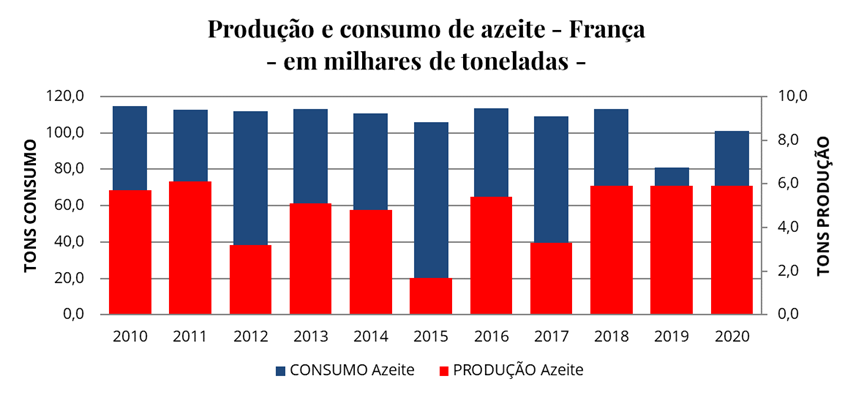 Com o avanço das fronteiras do Império Romano, sobremaneira na França a partir do século II a.C., principalmente na região de Narbonne – Gália ocorreu a proibição do cultivo da oliveira e das uvas, pois a intenção era criar dependência da produção Romana, semelhante ao que ocorreu no Brasil com a colonização portuguesa. Com a retração e queda do Império Romano, paulatinamente a cultura foi retomada e durante muito tempo teve um papel importante na alimentação do país, a exemplo do que já ocorria a desde antes com a Espanha e a Itália. Finalmente em 1848 a região dos Pirineus voltou a produzir azeite. Então veio outra grande retração.