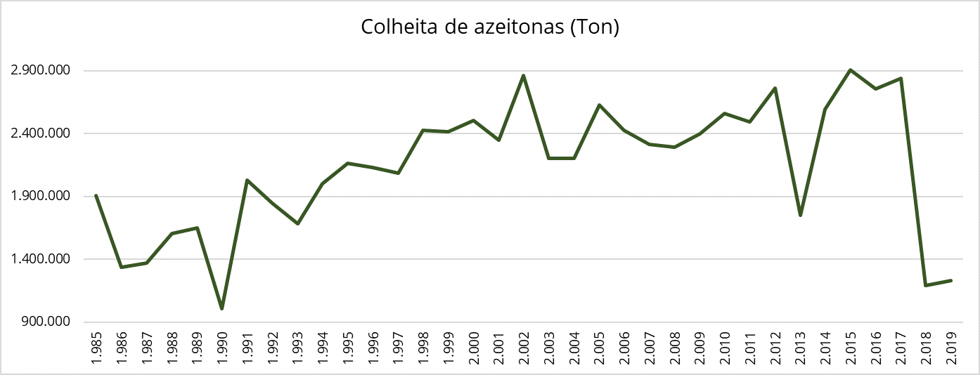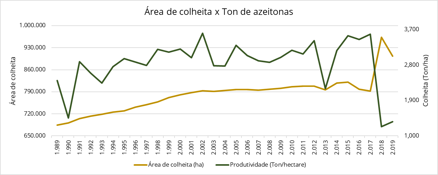 Mesmo com o esforço de aumento de área colhida, a produção total de azeitonas colhidas (não é azeitona de mesa) não pode ser mantida.