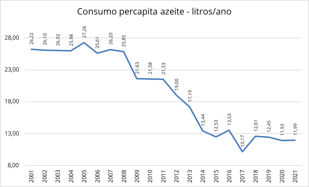 Ou seja: Em apenas 13 anos o consumo de azeite caiu 54%. Hoje se consome menos da metade que no começo dos anos 2.000. O grande vilão foi a crise econômica e a competição de óleos de semente e de origem animal: menos saudáveis, menos saborosos, contudo, bem mais baratos.
