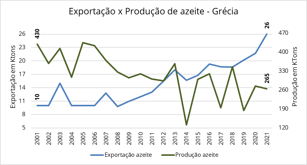 Importante: A princípio pode parecer estranho que um país onde a excedente de “azeitonas cruas” e “sobra” de produção de azeite e azeitonas de mesa tenha feito importação. A explicação fica em trono de oportunidade de custo, principalmente de locais com economia mais fraca e custo de vida mais baixo, bem como produtos específicos demandados por consumidores gregos.
