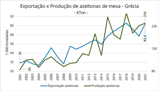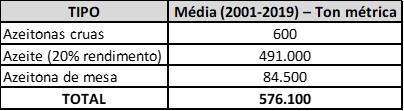 Na média, entre 2001 e 2019, possivelmente, forma exportados para países da UE um média de 84,5 mil toneladas de azeitonas de mesa por ano. O que representa 55,8% da produção total de azeitonas de mesa, enquanto a mesma comparação para azeite representa 30,8%.