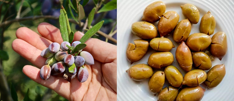 Fora da Grécia a conhecemos na cor preta – totalmente madura. Contudo há outra forma, mais comum na região de produção. É a azeitona em “veraison”, ou seja: a meia maturação com uma cor rósea.