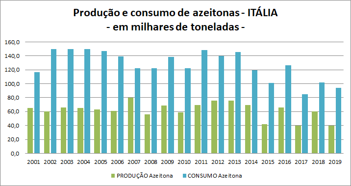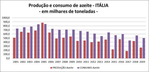 Em 2018 cada italiano em média consumiu 10,1 l. Se hoje o consumo na Itália não é maior, o mesmo deve-se apenas ao seu custo, que em competição com óleos oriundos de sementes e animais ganham em disparado em qualidade. Longe dos 17 l, em algumas regiões 30, dos gregos, mas muito superior aos menos 0,4 l de azeite por ano dos brasileiros…