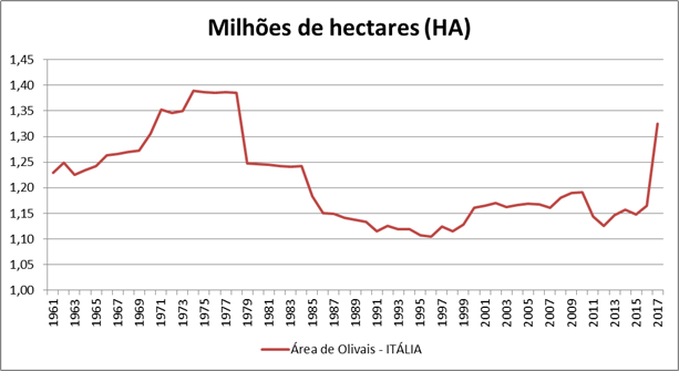 O número estimado de oliveiras na Itália em 2008 era de 150 milhões de árvores, distribuídas em uma área de 1.165.458 hectares.
