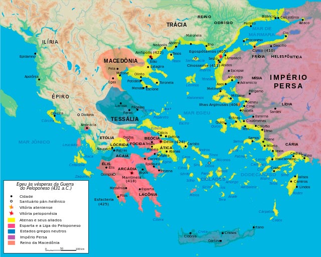 Anteriormente, em 480 a.C., o povo “Medos” do império Persa, atual Irã, havia desafiado os Espartanos, na Guerra chamada “Médica”. A batalha das Termópilas foi retratada no filme “300” de forma romanceada e ficcional.