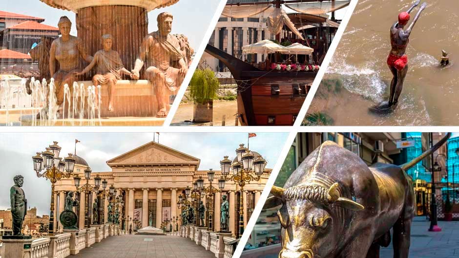 Outra curiosidade: Por ser uma país “novo” em um território “antigo”, palco de muitas histórias, o governo da Macedônia do Norte promoveu a reconstrução da capital com a criação de monumentos por toda a cidade. Entretanto muitas das estátuas, aparentemente, não tem significado histórico, e as vezes parecem uma simples cópia de outros lugares.