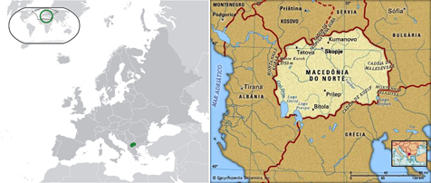 Sua capital é Skopje. O país tem 2.077.000 habitantes (estimativa de 2018) e área de 25.713 km2, uma área menor que estado de Alagoas no Brasil.