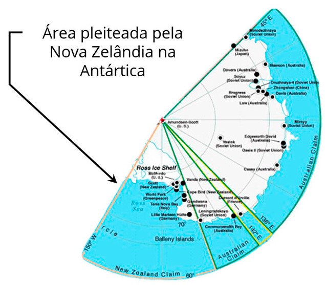 A Nova Zelândia ainda reclama uma faixa de território no continente antártico, onde mantém uma estação de pesquisa: Scott Base.