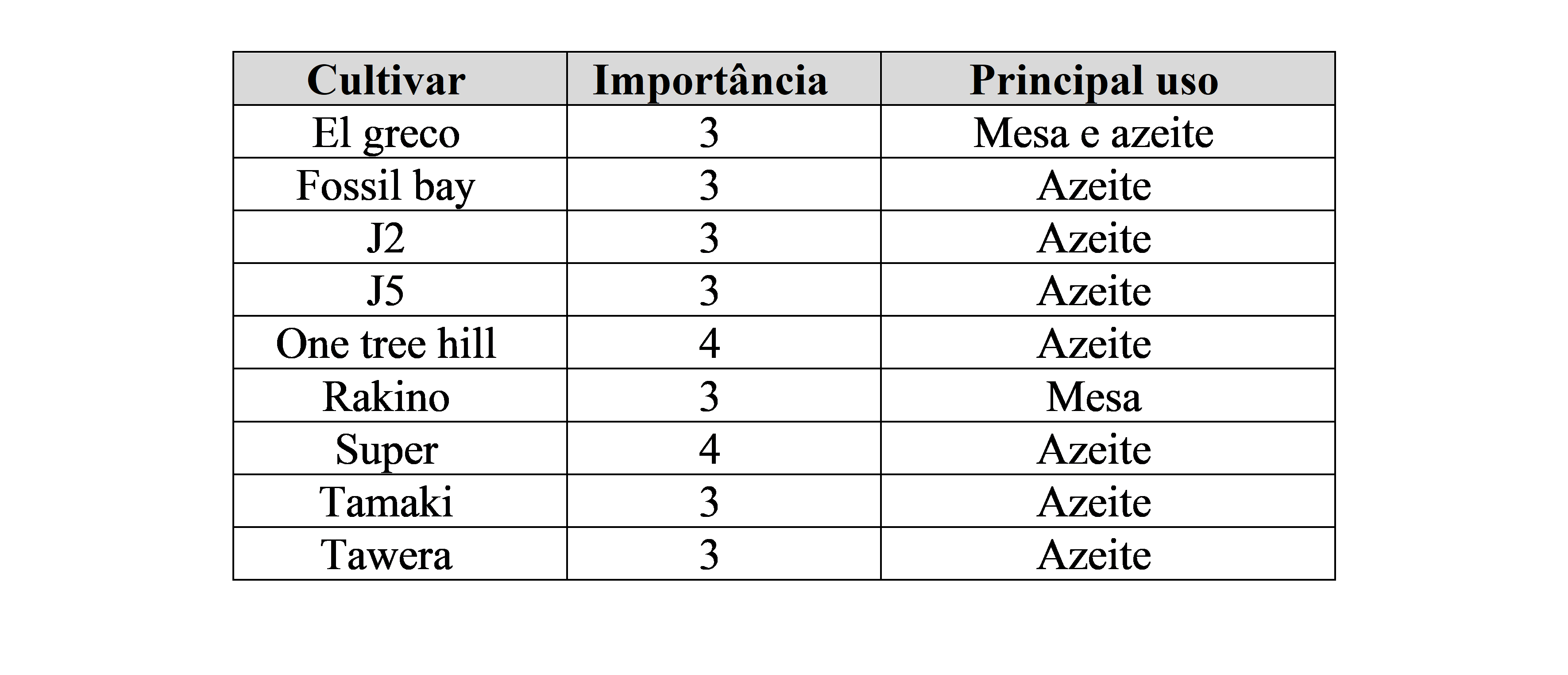 Observação: A baixa média em grau de importância refere-se justamente ao curto tempo do país dedicado a olivicultura, e ao desenvolvimento de cultivares que se adaptam às necessidades regionais.