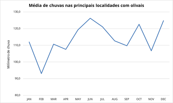 Conforme observamos acima, e verificando as condições básicas para o desenvolvimento da olivicultura, publicado em “Plantio – Parte I: Requisitos do Local” , os critérios ideias para cultivo de oliveiras são quase todos cumpridos, exceto pelo número de horas de insolação mínimo anual. O teórico mínimo é de 2.500 horas de sol direto por ano.